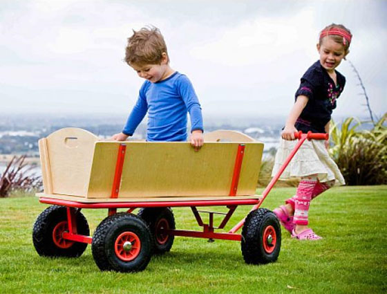 The Grand Wagon is very, well, grand. Super sized so the kids can jump on board, it’s made for a bit of rough and tumble, with inflatable rubber wheels for off-roading. The side panels are removable (for extra wide loads), and it’s the perfect transportation for themselves and their little friends.