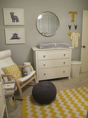 Mixing yellow, grey, chevrons and trees sounds crazy and mad but it works and has resulted in a really peaceful and calm nursery. I love the baby animal prints and the bookcase is great for toy storage. This nursery is just awaiting a little baby to join it!